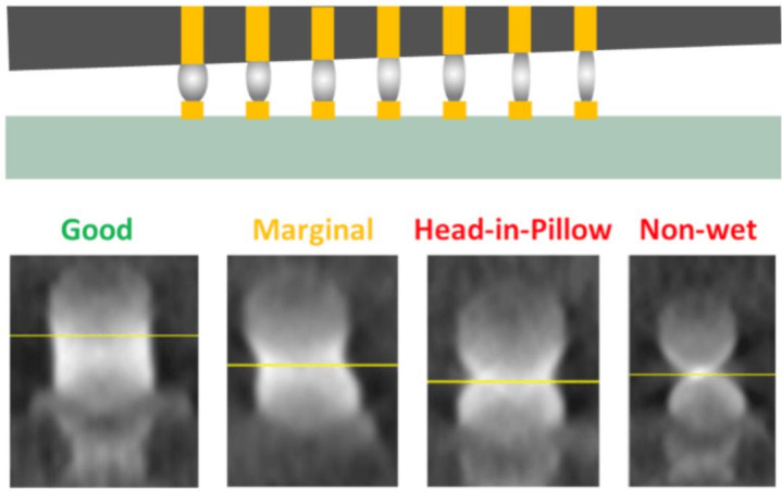 微凸块会遭受各种类型的缺陷,包括焊料颈缩、枕头效应和部分裂纹。枕头效应是一种潜在缺陷,其中一个焊球似乎陷入了下面的另一个焊球中,就像头枕在枕头上一样。一旦受到热应力或机械应力,就可能发生润湿不良故障。
